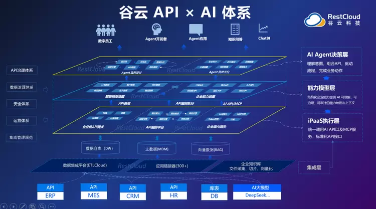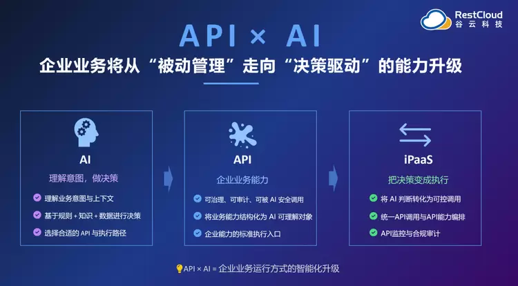 三者共同构成AI驱动业务的完整闭环,同时,谷云明确指出:API × AI并不取代现有业务系统,而是通过API驱动跨系统的智能业务执行,让企业系统从“被集成”,走向“被理解、被决策、被指挥”。