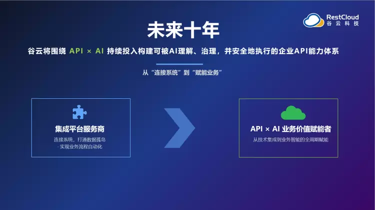 在发布会的最后,谷云科技正式宣布未来十年的定位升级:从“连接系统、打通数据孤岛的集成平台服务商”,走向“API × AI业务价值赋能者”。
