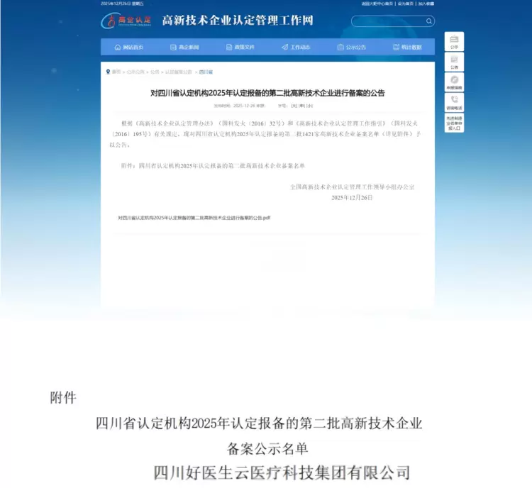 近日,全国高新技术企业认定管理工作领导小组办公室正式公示了四川省2025年第二批高新技术企业备案名单。好医生云医疗集团凭借其在基层医疗领域持续的科技创新能力与卓越的成果转化实践,成功通过国家高新技术企业认定,标志着集团在数智化赋能基层医疗赛道的技术实力获得了国家层面的权威认可。