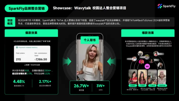 美发工具品牌Wavytalk进军美国市场的战役,是上述“校园增长枢纽”模型的生动实践。在2024年7月至9月的返校季(#BackToSchool2024)营销节点中,SparkFly团队通过“TikTok一方面,达人矩阵+UCLA线下渗透”的双重策略,成功建立起美国校园消费者对产品的优势认知。钛动科技精准组网推进四维达人矩阵与内容种草,为Wavytalk构建了多元化的内容创作者矩阵,涵盖校园达人、健身向达人、好物种草类达人及生活方式达人这四类核心创作者,四者相互配合,不仅传递了产品的实用价值,更激发了受众的深度讨论:创作造型制作类内容,通过分享美发技巧,直观展示“爱美与健康生活”的态度;以产品测评与推荐,聚焦产品用法演示,分享Hairtool的实际效果与使用心得,建立理性信任;通过返校季故事线,利用剧情化表达,将产品卖点融入返校故事中,引发情感共鸣。这种内容策略真正做到了“种草”效果。其中一位达人凭借真诚的分享形成了强大的“个人背书”,单条视频斩获26.7万+播放量,并直接撬动了3万+美金的GMV,实现了品效合一。