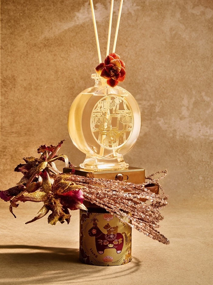 除走马灯礼盒外,系列亦推出更适合日常陈设与空间氛围的「金玉满堂」发光居室香薰,以“钱币”造型寓意八方来财,搭配发光底座与 300ml 异形散香器,在灯亮的一瞬,香气随光入室,令“金玉满堂”的好意头更为可见。