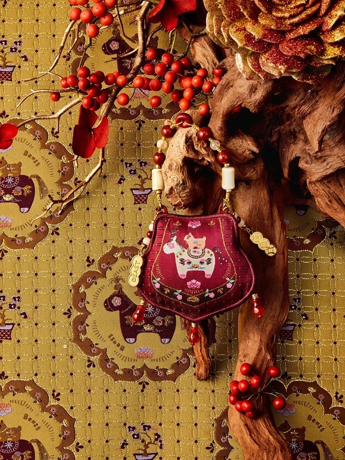 与此同时,系列同步上线「马上有柴」织标香囊,以传统马鞍轮廓为灵感,织标图案为小马背小柴犬,取“柴(财)”之谐趣,并配手工珠串,为年礼增添更轻巧的日常佩挂方式。