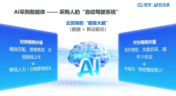 而慧策“AI采购智能体”则堪称采购人的“自动驾驶引擎”,依托海量数据与智能算法,将传统数周的选品、比价、匹配流程压缩至小时级甚至分钟级。对分销商,它能锁定低价货源、支持先卖后采,彻底摆脱资金与库存压力;对供销商,它可精准匹配分销伙伴,让渠道拓展从“人海战术”转向“智能推送”,大幅降低运营成本。