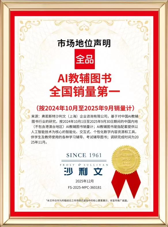 沙利文基于其对中国AI教辅图书行业进行多维度,深度研究评估。调研数据显示,全品销量显著领先于同类产品,受到市场的广泛认可。