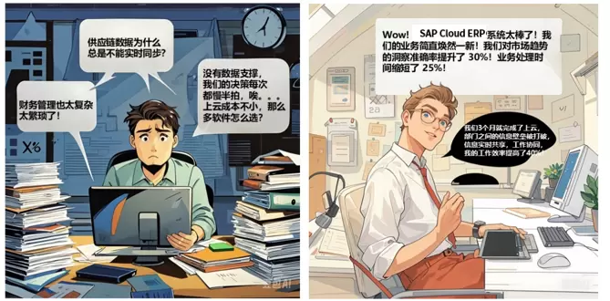 例如大王精铸,在实施SAP Cloud ERP之前,大王精铸面临着生产效率低下、成本控制困难等问题。通过部署SAP Cloud ERP,大王精铸将各部门的数据彻底打通,实现了人、机、料、工、法的立体管控,生产周期和销售预测准确性显著提高,准时交货能力也得到了大幅提升。