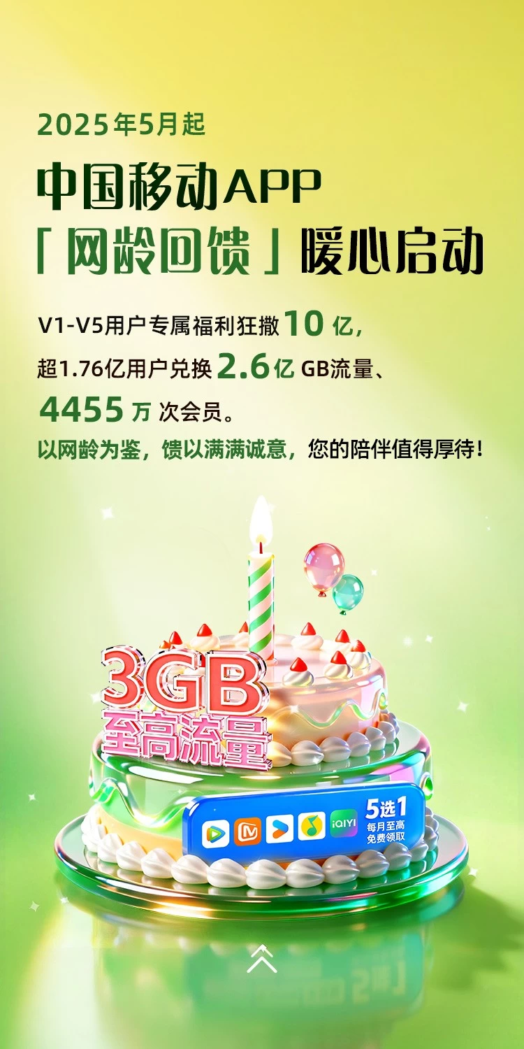 网龄回馈礼,厚待每一份信赖。时光向前,成长不断!中国移动 APP「网龄回馈礼」5月暖心上线,面向不同网龄等级用户,推出网龄成长礼、网龄生日礼以及网龄惊喜礼三大回馈,参与即可领取流量券、话费券、电影抵扣券等多重福利!网龄层级越高,尊享权益越丰厚~2025面向10亿用户狂撒福利,累计超1.76亿用户参与活动,兑换2.6亿GB流量和4455万次会员服务。