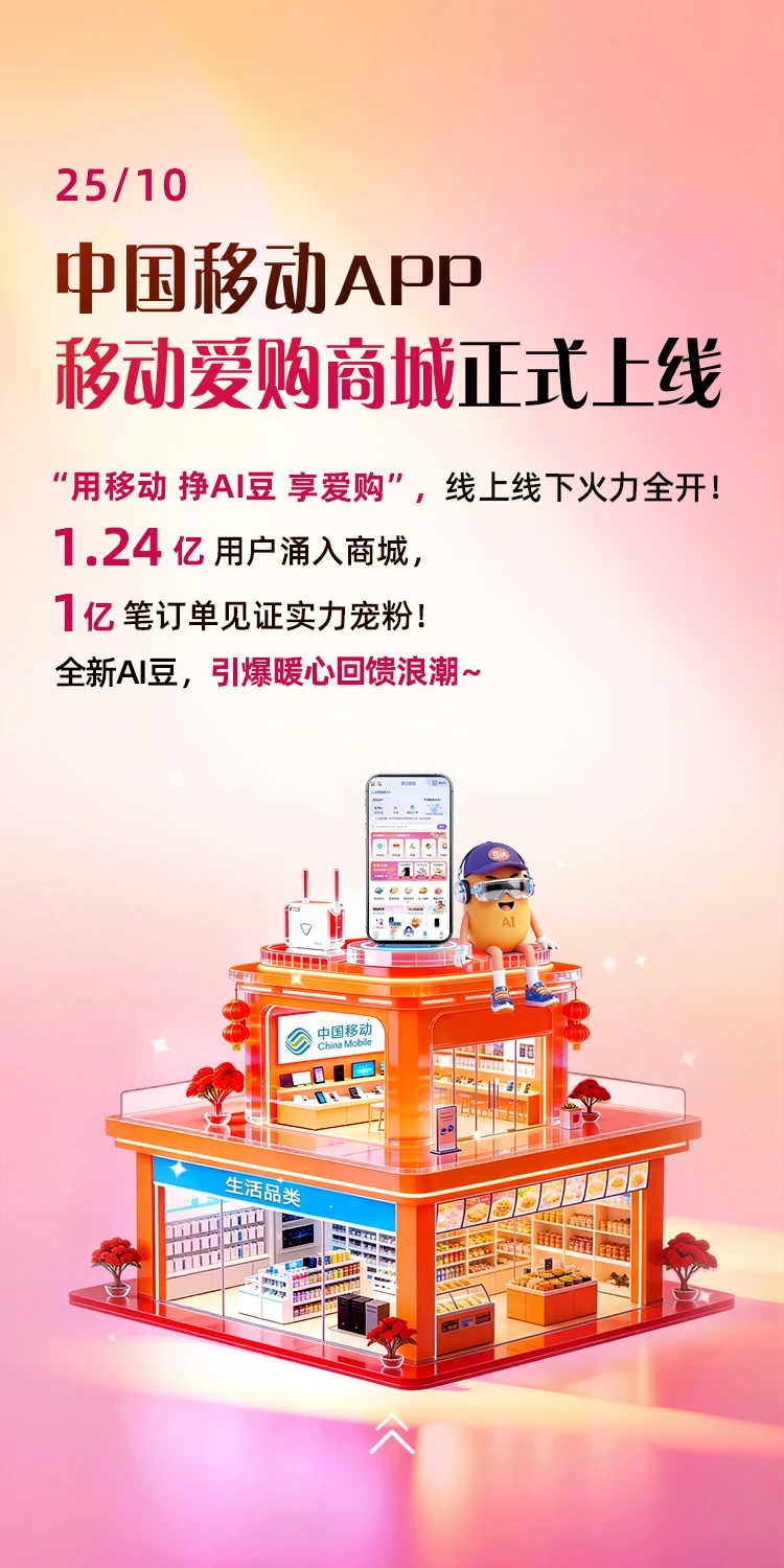 此外,移动爱购商城创新推出“AI豆”统一回馈体系,通过话费消费累计、参与平台活动等方式轻松获取AI豆,可直接用于兑换礼品、抵扣消费,让用户的每一次参与都能转化为实实在在的权益。目前,中国移动APP已上线了“AI豆红包”、1豆兑等互动活动,让用户体验“用移动,挣AI豆,享爱购”的乐趣。