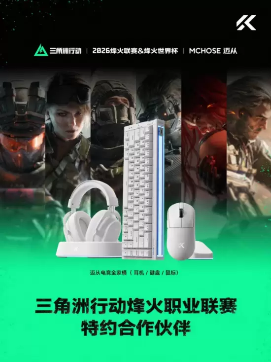 而迈从作为国产外设领域的代表品牌,也正式成为2026年《三角洲行动》烽火职业联赛及烽火世界杯的特约合作伙伴,迈从电竞全家桶成为官方赛事指定设备。