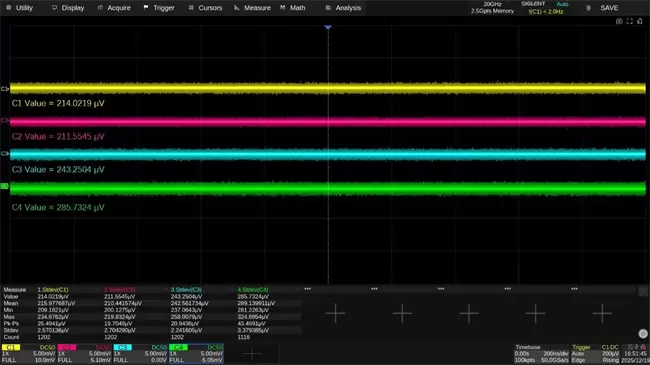 SDS8000A系列采用高性能硬件架构,20 GHz全带宽下四通道均可实现270 μVrms(typ.)的超低本底噪声,有效降低仪器自身对被测信号的干扰,即便在高带宽与高速采样条件下,仍能保持信号的纯净度与真实性,为精密测量与高速测试提供更可靠的波形保真度。