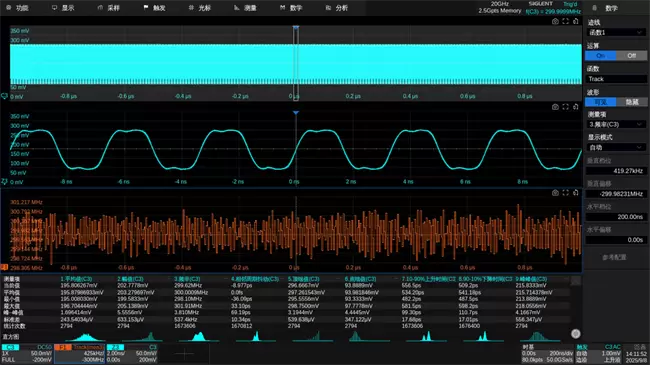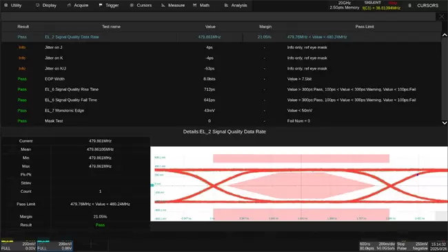 SDS8204A内置专业的眼图与抖动分析功能,能够从高速串行数据中提取时钟并生成清晰、稳定的眼图。系统支持一键式眼图参数测量,包括眼高、眼宽、抖动(RJ/DJ)等关键指标,并集成信号均衡功能,改善波形质量。用户还可根据行业标准或自定义模板进行眼图测试,快速判断信号质量是否符合规范。此外,仪器提供抖动与噪声成分的频谱视图与直方图,便于深入分析各类噪声与抖动来源,为高速接口的调试与信号完整性验证提供完整解决方案。