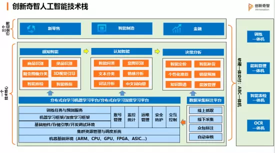 人工智能应用落地过程中,往往面临软硬件不兼容、部署技术门槛高、不易规模化复制等问题。为解决人工智能应用落地最后一公里问题,在三大行业应用背后,创新奇智打造了一个以分布式自学习机器学习与深度学习平台、数据采集标注平台为基础,覆盖感知智能、认知智能、决策分析等三大AI技术方向的人工智能技术栈。围绕该技术栈,我们采用软硬一体的产品交付方式,让企业开箱即用创新奇智的人工智能解决方案,无需再做复杂的设置。
