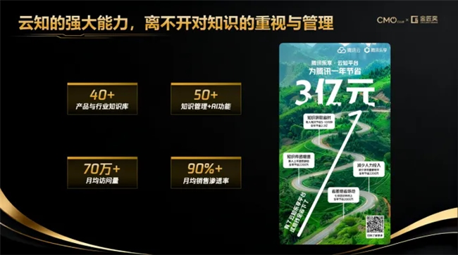 经过多年打磨,云知已建成40个以上行业与产品知识库,开发50个以上知识管理与AI功能,月均访问量超70万,销售月均渗透率达90%以上,每年可为腾讯节省成本超3亿元,实现了“新人上手速度翻倍、知识传递提速、组织成本显著降低”的多重价值。