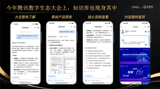 大型活动的高效协同:例如,在2025年腾讯全球数字生态大会中,云知支持市场部实现了非传统的沟通协作方式。大会重要信息,如嘉宾邀约时间、专场信息截止日期等,均可在知识库中一键查询,避免了多群沟通造成的信息偏差,知识库取代了碎片化的沟通群,成为信息重要的来源,确保销售与客户获得的信息高度一致。
