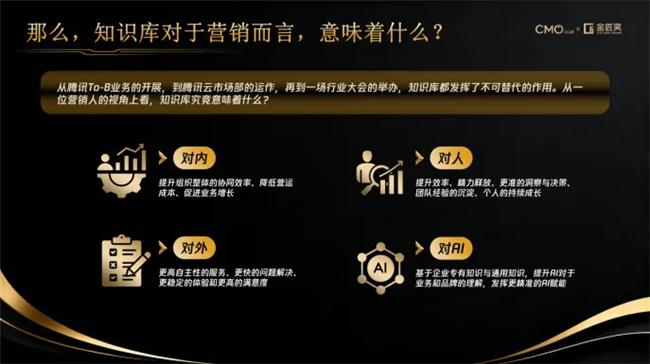 陈伟强调,知识库对营销的价值体现在四个维度:对内,提升组织协同效率、降低运营成本;对外,提供自主化服务,提升客户满意度;对人,释放员工精力,助力精准决策与个人成长;对AI,注入企业专有知识,实现更精准的业务赋能。