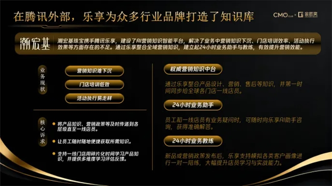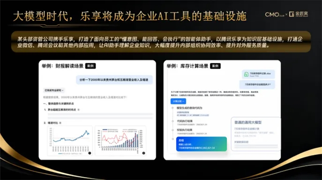 陈伟在演讲中分享了两个极具代表性的案例。在潮宏基,乐享AI知识库成为了24小时业务教练,不仅帮助全国门店导购随时获取新品品牌故事,还能通过客户画像模拟进行“实战对练”。而在某头部资管公司,乐享展现了极高的专业厚度——它能跨文档,基准完成研究、计算等复杂任务,同时严守金融级别的数据安全底线。