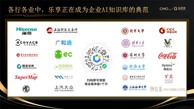 如今,乐享的合作客户已覆盖金融(如中金公司、中信银行、友邦保险)、制造(如海信、上汽大众、科沃斯)、教育(如北京大学、清华大学、上海海事大学)等多个领域,成为企业AI知识库的行业典范。
