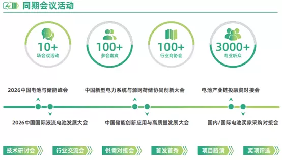 本届展会期间将举行“2026中国国际液流电池发展大会”、“中国储能创新应用与高质量发展大会”和多场平行论坛、新品发布、资源对接、颁奖典礼等配套活动,围绕新型电力系统和新型能源体系建设、新型储能、电池、绿色智算、水风光储氢一体化、绿色能源、充换电等行业热点,邀请电力能源、电池技术领域权威专家进行深入交流,探讨绿色能源新技术、新模式、新业态,助力能源产业数字化、智能化、绿色化转型,实现高质量发展。