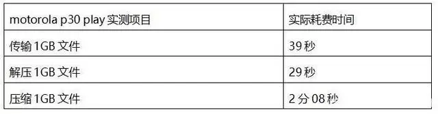 为了真实反映motorola p30 play的综合性能,我们又做了文件传输、解压、压缩测试等三项测试。测试方法:用手机原装的数据线从电脑端传输1GB文件(压缩包)至手机存储器中,记录用时。通过手机自带的压缩软件压缩1GB的文件,用时越少手机性能越好。使用手机自身解压缩软件解压1GB文件并记录用时。有人会问,这个测试有什么用?模拟用户的真实场景需求,通过真正实际的测试,用测试数据来证明这个产品实际的性能。