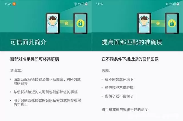 面部识别功能也被加入其中,实际体验中相当迅速。不过系统提示,这项面部识别添加的“可信面孔”存在相似面孔也能解锁的情况,用户可以通过不同的外部环境以及面部细节来强化可信面孔的准确度。在实际测试之后我们并没有发现其他面孔能够解锁手机的情况发生,大概是我们的面部比较“与众不同”。