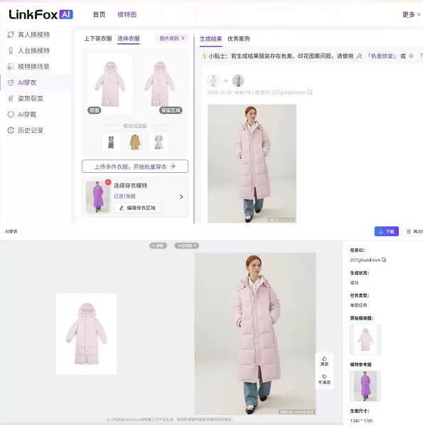 功能作用:“AI穿衣”主要分为上下装衣服和连体衣服两大模块,专注于跨境电商领域的AI设计,可上传多件衣服,批量穿衣。