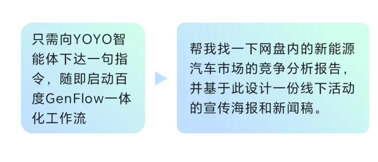例如用户想洞察某行业的市场竞争格局,只需向YOYO智能体下达指令,授权后便会启动百度GenFlow一体化工作流,⾃动检索百度文库、用户授权后的个人⽹盘等资源并智能整合,将散落在百度文库、⽹盘各处的信息碎⽚,⾃动整理归纳,将用户从“资料搬运⼯” 中彻底解放。
