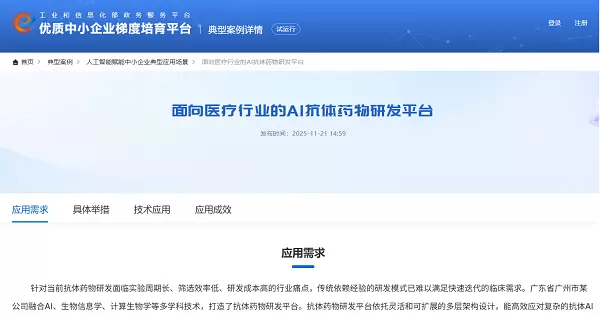 此次发布的中小企业人工智能典型应用场景包括238个,涵盖优化业务流程、创新产品服务等方面,广州赛业百沐生物科技有限公司(以下简称赛业生物)「AbSeek®智能抗体计算平台」顺利入选2025年度中小企业人工智能典型应用场景!