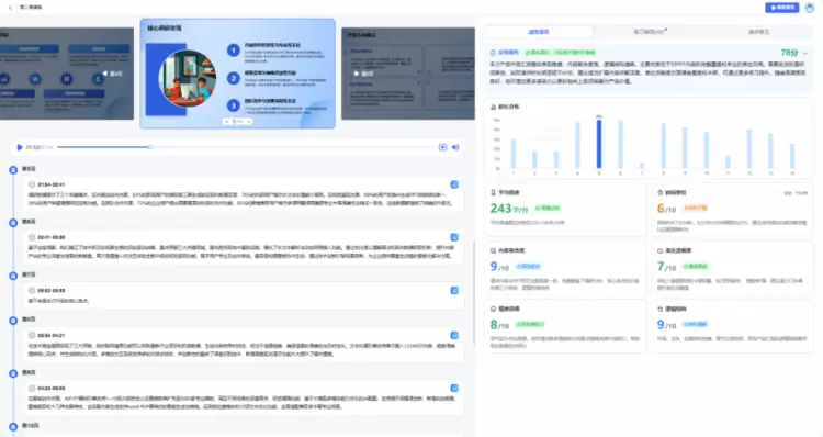 AI给反馈,科学提升:每次演练结束,系统会自动生成全局分析报告,从平均语速、时间掌控、内容契合度等维度进行评分,并提供逐页的改进建议,帮助用户针对性强化表达弱点。