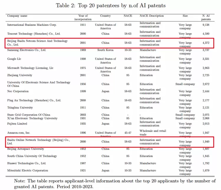 掌握核心AI专利已成为衡量技术主动权的关键因素。近期,意大利卢卡IMT高等研究学院与斯坦福大学以人为本人工智能研究所联合发布的论文《掌控智能:全球人工智能专利格局》指出,全球AI专利格局呈现“高度地域集中”特征,中美构成全球AI创新“双极”。在论文统计的“全球TOP 20 AI专利授权人”榜单中,百度以6312件AI专利授权总量排名全球第二。