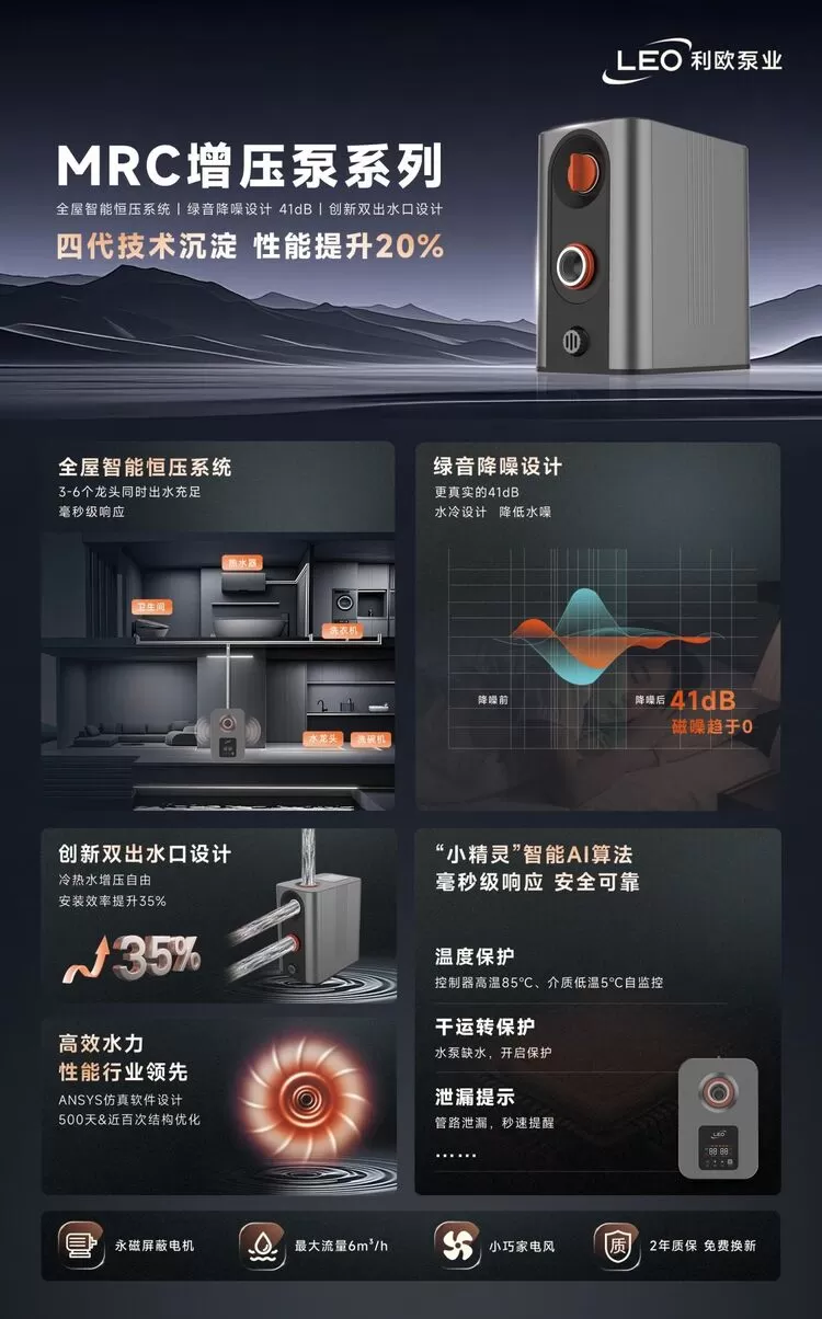 针对家庭用水场景,利欧MRC/TRC永磁智能增压泵堪称“全屋水压管家”。其核心竞争力源于第四代永磁技术与“类人脑”AI算法的完美协同。该泵搭载永磁屏蔽电机及进口森萨塔传感器融合变频技术,可实现全屋3-6个龙头同时稳定出水,让用户彻底告别用水高峰期的水压焦虑。更值得称道的是其AI级稳压算法——利欧博士后团队通过ANSYS仿真软件,运用三元流理论与GA-RBF神经网络法,经近百次水力仿真优化,实现高效水力模型,性能较前代提升20%。产品运行噪声最低仅41分贝,如图书馆般静谧,且具备冷热双出水口设计,安装灵活便捷,适配各类户型。