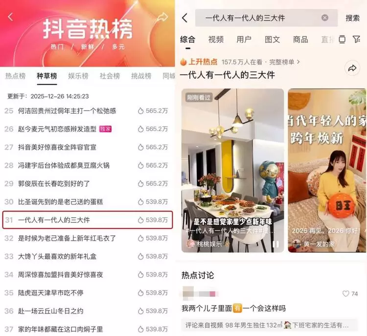 本次活动的传播起点,始于#一代人有一代人的三大件这一简单却能引发广泛共鸣的热点话题。它巧妙地避开了直接的产品推介,转而探讨一个关于“美好生活”的深层社会命题。它激活了不同代际用户的集体记忆与表达欲,促使人们自发分享、比较与定义属于自己时代的“幸福标配”。从过往的“自行车、手表、缝纫机”,自然延伸至当下定义品质生活的“冰箱、洗衣机、空调”,实现了经典话题的当代诠释与破圈传播。数据显示,该话题最终登陆抖音种草榜TOP31,最高在看人数超过157.5万,为活动赢得了宝贵的“注意力资产”。