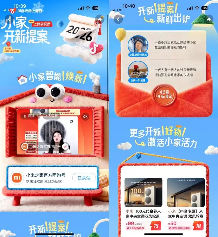基于这一理念,「小家开新提案」聚焦“家电/家生活”核心品类,为用户提供一系列快捷、仪式感、易实现的“开新”方案。在产品价值的传递上,也脱离了参数的单向宣告,转而进入可感知的生活情境。首席合作品牌小米作为品类代表,品牌价值被进行了全新的演绎:小米中央空调Pro双风轮系列“1分钟速冷热”的硬核性能,被诠释为“推门入户,暖意随即包裹周身”的即刻抚慰;“双风轮洁净送风”的技术逻辑,则关联着“气息在室内温和流转,安享每一口清新呼吸”的静谧守护。产品优势不再悬浮于纸面,而是融入了我们对理想居家生活的具体想象,技术的意义,最终落脚于具体而微的生活体验。