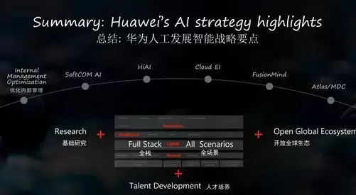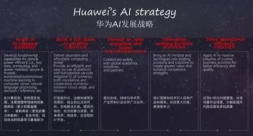 在会上,华为副董事长,轮值董事长徐直军对华为人工智能发展战略做了陈述讲,将华为AI发展战略概括为以下五大方向:强力投资基础研究、打造全栈解决方案、投资开放生态和人才培养、解决方案增强以及内部效率提升。