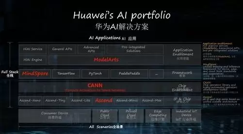而这两款AI芯片和CANN( 芯片算子库和高度自动化算子开发工具),MindSpore(支持端、边、云独立的和协同的统一训练和推理框架),应用使能(提供全流程服务(ModelArts),分层API和预集成方案)联合起来构成华为的全栈方案。