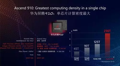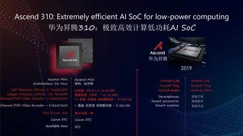 除此之外,徐直军还发布了华为两款新型AI芯片——昇腾910和昇腾310。据了解,这款AI芯片都将采用达芬奇架构,昇腾910的每秒浮点运算次数将会远超英伟达的V100,是目前全球已发布的单芯片计算密度最大的AI芯片。而昇腾310则是目前面向计算场景最强算力的AI SoC。