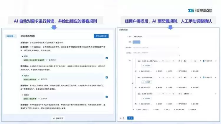 受众模糊“配不准”:难以精准定义受众,导致策略与客群标签错位,营销效率低下。经验有限“配不全”:靠个人经验圈客,只能覆盖“见过的客户”,容易遗漏高潜客户。规则复杂“难落地”:业务想法难以拆解为具体的数据字段与逻辑组合,难以高效执行。产品升级:重新定义客群圈选