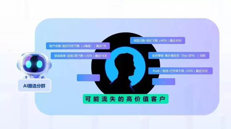 圈客更精准:告别受众猜测。AI基于行业实践经验,从模糊的业务目标中,拆解匹配产品属性的客户特征组合,直指核心潜客。圈客更全面:突破经验边界。AI整合了多企业、多场景的成功经验,可挖掘跨行为、跨维度的潜在关联特征,更大限度覆盖存量池中所有高潜客户。圈客更高效:降低操作门槛。一句话描述,分钟级生成可执行的精准分群方案,让业务人员从繁琐的配置中解放,专注于策略制定与优化。场景落地:重塑存量经营增长逻辑