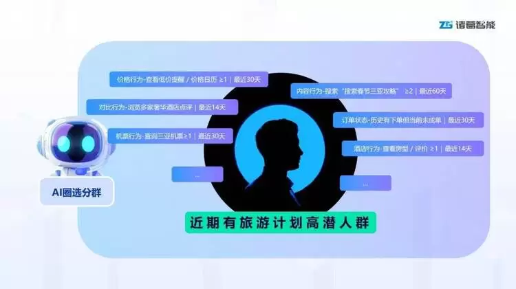 解决方案:平台通过诸葛平台,AI自动关联跨渠道用户行为,将“搜索春节三亚攻略、浏览奢华酒店点评、查询三亚机票”等分散但强相关的行为,构建“复合出行意图”模型,精准锁定高潜人群。