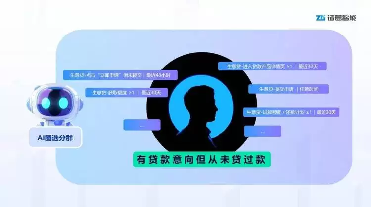 解决方案:通过诸葛「AI圈选分群」,业务人员可直接描述业务目标,如“把有贷款意向但从未贷过款的用户圈出来”,系统自动拆解为行为信号、历史状态与时间窗口组合规则,快速形成可执行分群,用于定向触达或客户经理跟进。