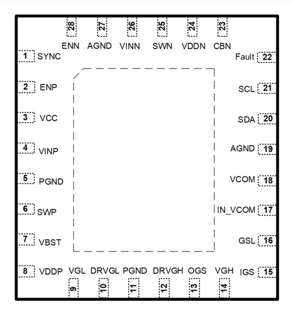 MPQ5613D-AEC1强大的保护功能可保证设备的安全运行,具体功能包括输入欠压锁定 (UVLO) 保护、SWP/SWN 逐周期限流保护、过温保护 (OTP)、VDDP/VDDN/VGH/VGL 欠压保护 (UVP)、VCOM 输出过流保护 (OCP) 以及VDDP输出限流保护。
