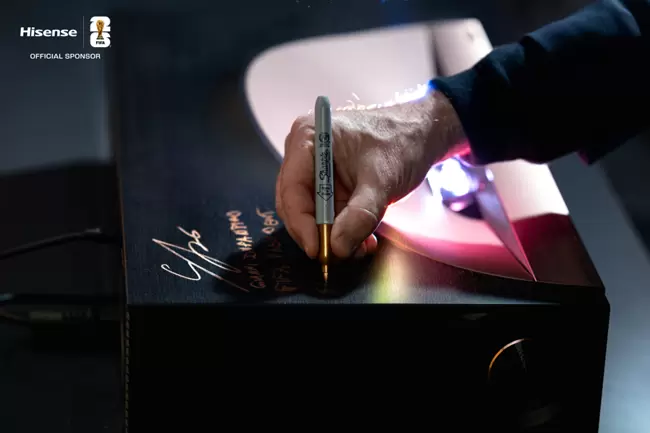 值得一提的是,国际足联主席因凡蒂诺“打卡”海信展区,他近距离体验了150吋海信探索X1 Ultra的震撼视听效果,大力点赞海信激光显示技术,并在激光电视主机上留下纪念签名。