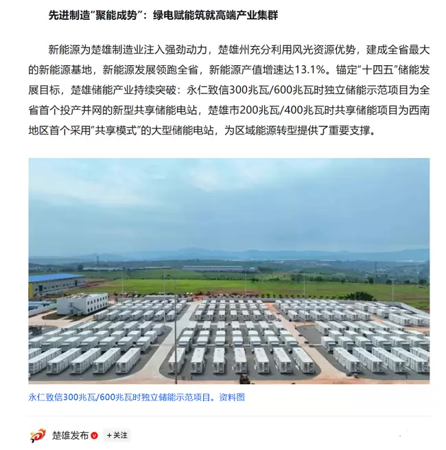 永仁 300MW/600MWh 独立储能项目:云南首个大规模共享储能项目,年放电量 1.8 亿度,为周边 400 万千瓦新能源项目提供容量租赁服务,投产后助力楚雄州形成百万千瓦级储能调节能力。