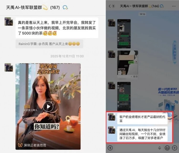 真正的转型突破不仅在于自身业绩增长,更在于商业生态的重构。吕杰在自身取得成果后,将 AI 获客方法应用于线下私域运营,引发经销商热烈反响。洞察到流量痛点是所有经销商的共同难题,他果断加入天禹高级合伙人计划,依托天禹赋能中台体系,完成了从 “传统茶企老板” 到 “AI 营销系统推广者” 的身份转变。
