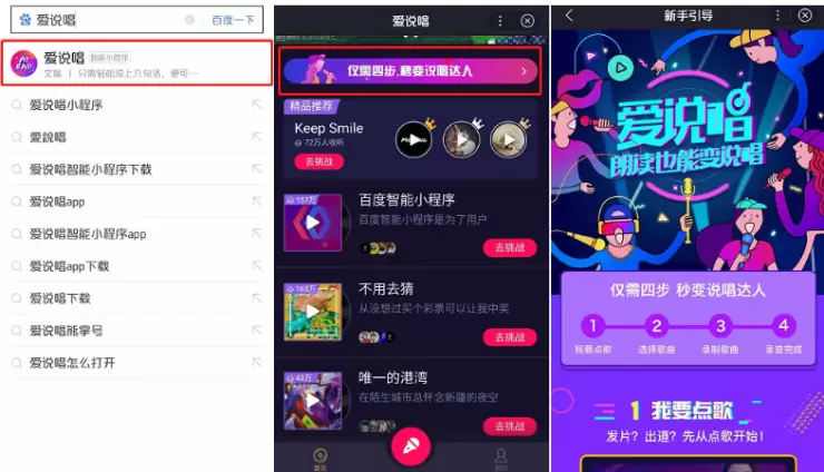 进入“爱说唱智能小程序”后,用户可以根据屏幕上方的新手引导进行操作。只需要点歌、选择歌曲、录制歌曲、录音完成四步就可以完成自己的Rap演唱。