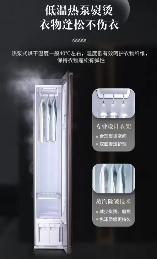 最怕高温熨烫的损伤 —— 澳柯玛以 “低温热泵熨烫技术”,给出了更温柔的解决方案:热泵式烘干温度控制在 40℃左右,既能高效烘干潮气,又能精准呵护羊绒、真丝等脆弱纤维,让衣物始终保持蓬松有弹性,搭配 “专业设计衣架” 与 “蒸汽塑型除皱技术”,护理机实现了 “双面渗透护理”:蒸汽均匀包裹衣物,减少手动熨烫的磨损,同时抚平褶皱、还原衣物版型;无论是出席重要场合的西装,还是需要精细养护的连衣裙,都能在护理后恢复平整质感,省去往返干洗店的时间与成本。