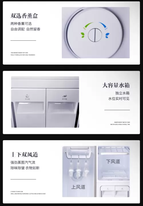 在用户不易察觉的细节里,更见产品的用心:配备 “大容量独立水箱”,水位实时可见,无需频繁加水;“双风道循环系统” 让蒸汽覆盖更均匀,护理效率更高;机身净重 59kg,稳固不易晃动,同时预留合理操作空间,日常取放衣物更便捷。