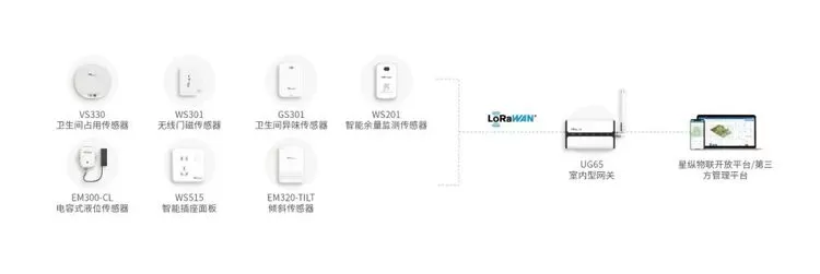 WS201智能余量监测传感器安装于卫生纸盒内,实时监测纸巾余量;EM300-CL电容式液位传感器实时监测洗手液余量,纸巾和洗手液余量不足时发送告警,通知保洁人员及时进行补充,避免出现缺纸、缺液情况。