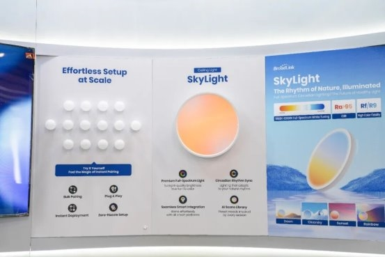 此外,博联还展出了多款设计美学与智能功能兼备的创新单品。其中,具备晨曦、星空等多种情景光效的智能吸顶灯,可根据用户心情、时段一键切换氛围,不仅拓宽了家庭光环境的个性化选择,也让照明从单一的功能需求,升级为能够调节情绪、营造空间美感的重要元素。同时,包括智能中控屏、面板、传感器、安防产品在内的全屋智能单品矩阵也一同亮相,完整展现了博联从核心连接能力到终端设备的一体化解决方案能力。