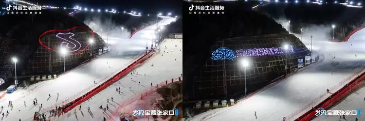 当夜幕降临,压轴大戏「雪地激光秀」震撼启幕。高流明激光投影设备在雪道旁的山体上,精准投射出抖音生活服务动态logo、宝藏张家口。五彩斑斓的光束在山体上跳跃流转,时而如极光漫舞,时而如流星划过。夜滑游客可从雪道顶端俯冲穿越光幕,体验"穿光破影"的精彩瞬间。翠云山以一场冰与光的视觉盛宴,点亮夜滑族的Passion时刻,让夜晚的滑雪场焕发出不亚于白昼的迷人魅力。