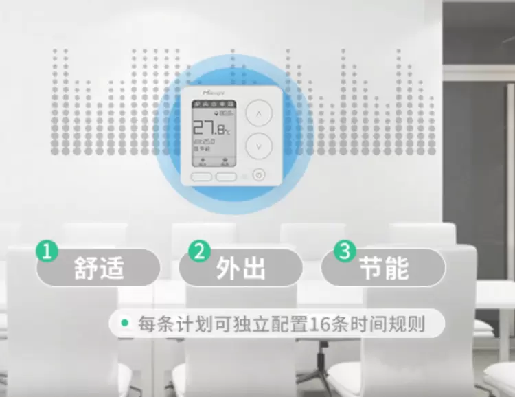 设备支持3条本地计划(舒适、外出、节能),每条计划可独立配置16条时间规则;同时可自定义计划中的制热目标温度、制冷目标温度、温控允差以及风扇模式,充分满足多样化的个性化使用需求。
