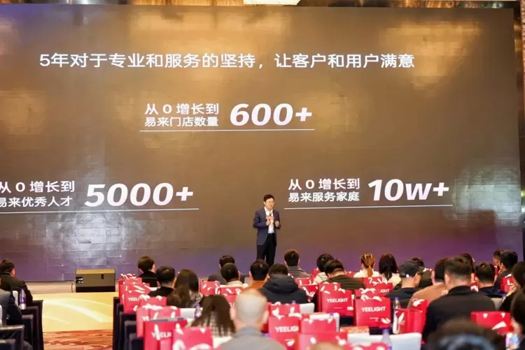 会议开始,易来CEO姜兆宁带来深度分享,全面复盘了Yeelight Pro六年来的发展成就,展望了品牌未来的发展路径。他提到,历经六年深耕,Yeelight Pro已构建起强大的生态基础,门店数量稳步增长至600家,为全屋智能行业培育了超5000名专业人才,服务用户数量成功突破十万。这份亮眼成绩的背后,是品牌对专业与服务的执着坚守,也正是这份坚守,赢得了广大客户与用户的认可与信赖。